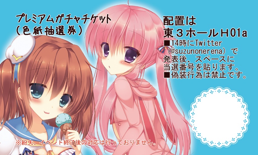 ・尚、鈴音れなは午後13時半から私情により不在です。その為、スケブはいつもより受け付ける数は少なくします。その日の体調などによりますが今のところ3冊までと考えています